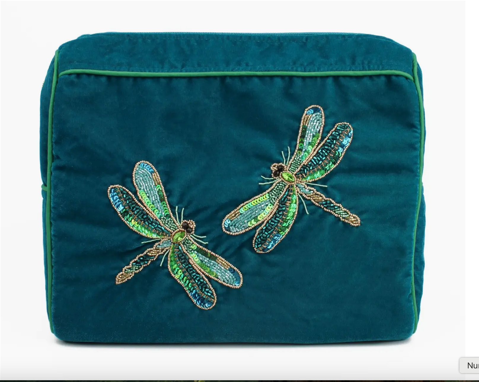 Fly into style with our Beaded Blue Dragonfly Large Pouch! This stunning pouch is handcrafted by artisans in India, featuring a dazzling dragonfly design made with vibrant colors and textures. With a spacious 250 x 180mm size and water resistant lining, it's perfect for storing all your essentials. Made from luxurious polyester velvet and adorned with glass beads, this pouch is both functional and fashionable. Buzz-worthy accessory, indeed!