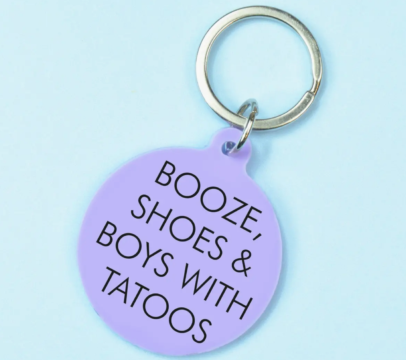 Add some cheeky charm to your keys with the Booze, Shoes & Boys with Tattoos Keytag. Perfect for gifting or keeping as a fun personal accessory, this playful key tag lets you show off your sassy side wherever you go.