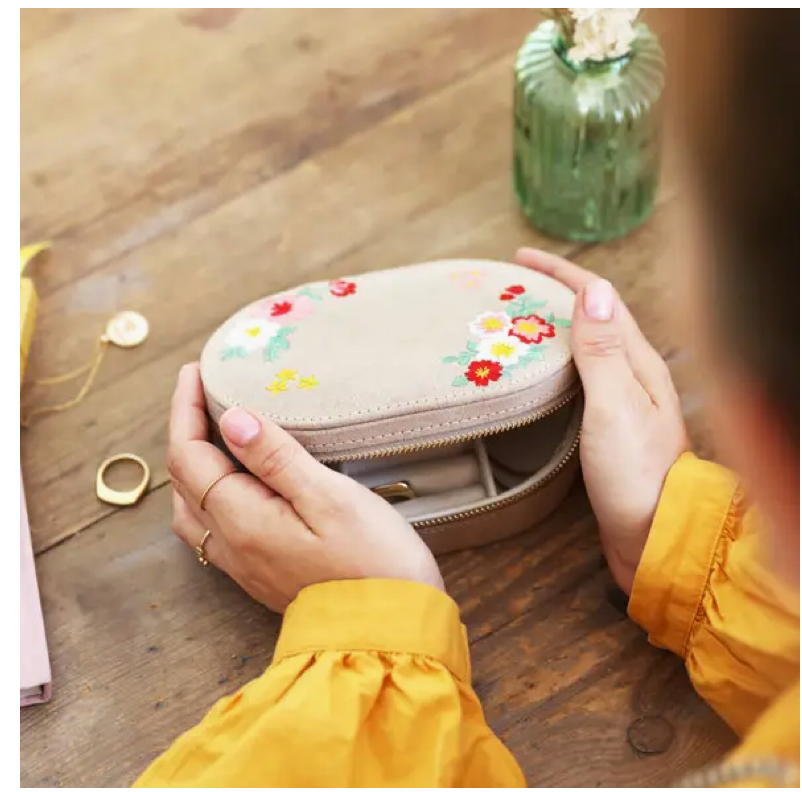 This oval velvet jewellery box is a must-have for any jewellery lover. With delicate floral embroidery, it's both beautiful and functional. Keep your special pieces safe and organized on the go. A stylish accessory for any collection.