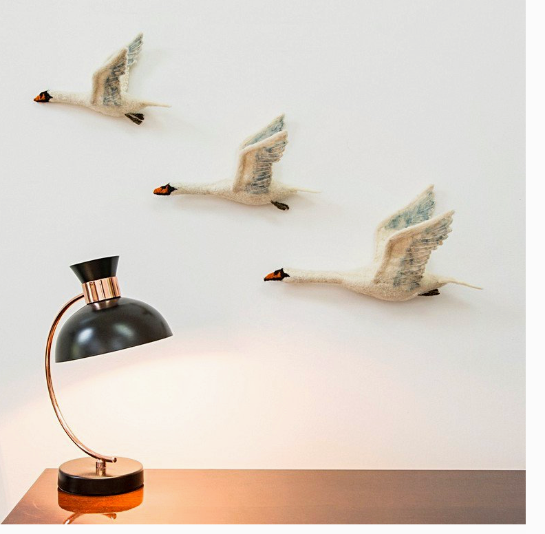 Add a whimsical touch to your home with Sew Heart Felt's Flying Swan Wall Trio. These feathery friends come in various sizes and gracefully hover on your wall with the help of wire loops. Perfect for adding a playful touch to any room!