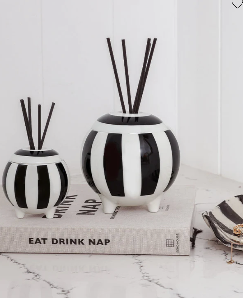 Elevate your space with this hand-poured ceramic diffuser, a stunning blend of jasmine, amber, and saffron that transforms any room into a sanctuary of warmth and romance. Topped with bold stripes and luxe foiling, this beauty isn't just a fragrance vessel—it's a keepsake. Once the 350ml diffuser has worked its magic, repurpose the gorgeous ceramic for trinkets, candles, or whatever sparks joy. Let the intoxicating top notes of jasmine and saffron draw you in, while the heart of warm amber wraps around you like a cosy embrace, grounded by fir resin and cedarwood. Pure indulgence that lasts long after the scent fades.