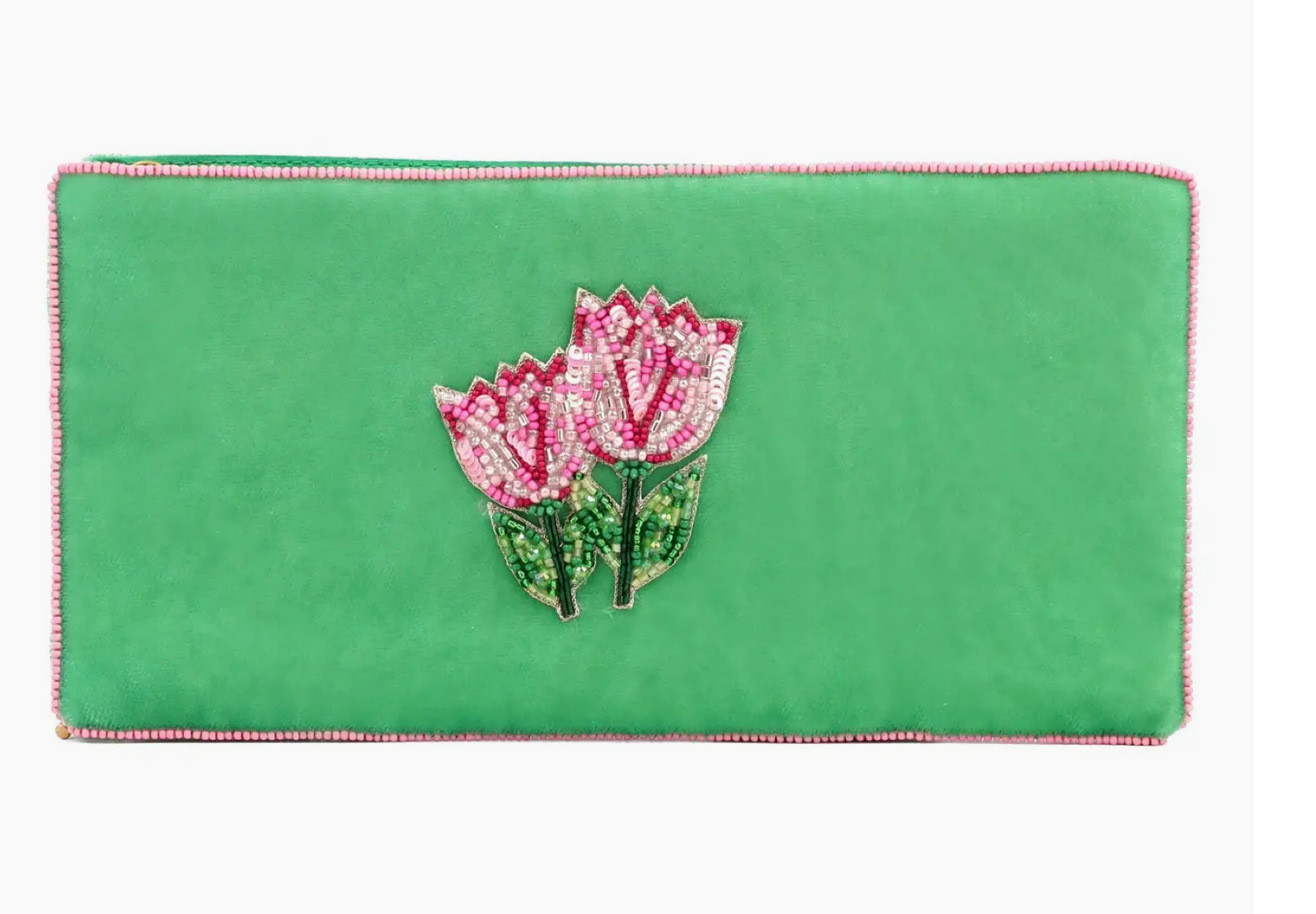 Brighten your day with this charming pink tulip pouch! Crafted from sumptuous green velvet and adorned with colourful beads, it's the perfect companion for stashing your treasures. Whether you're organising jewellery, cosmetics, or little keepsakes, this delightful multi-use pouch keeps everything safe and sound in style. A playful pop of nature-inspired design that brings joy to everyday organisation.