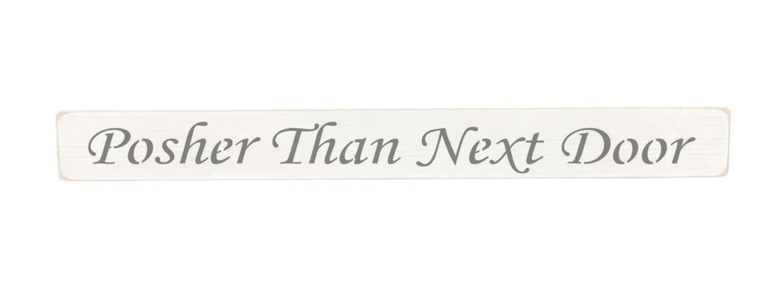 Elevate your home's sass factor with our "Posher Than Next Door" wooden sign! Handcrafted from solid aged Pine, this 90cm x 10cm conversation starter brings cheeky charm to any wall. Perfect for those who enjoy a playful nod to neighborly competition – because sometimes it's fun to brag a little!