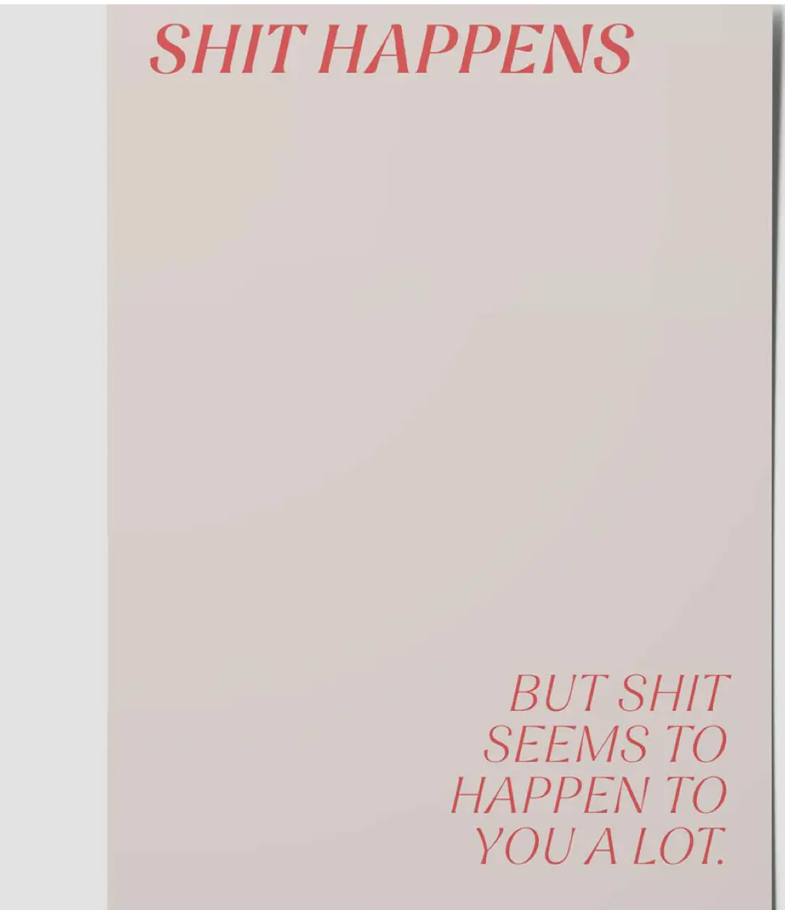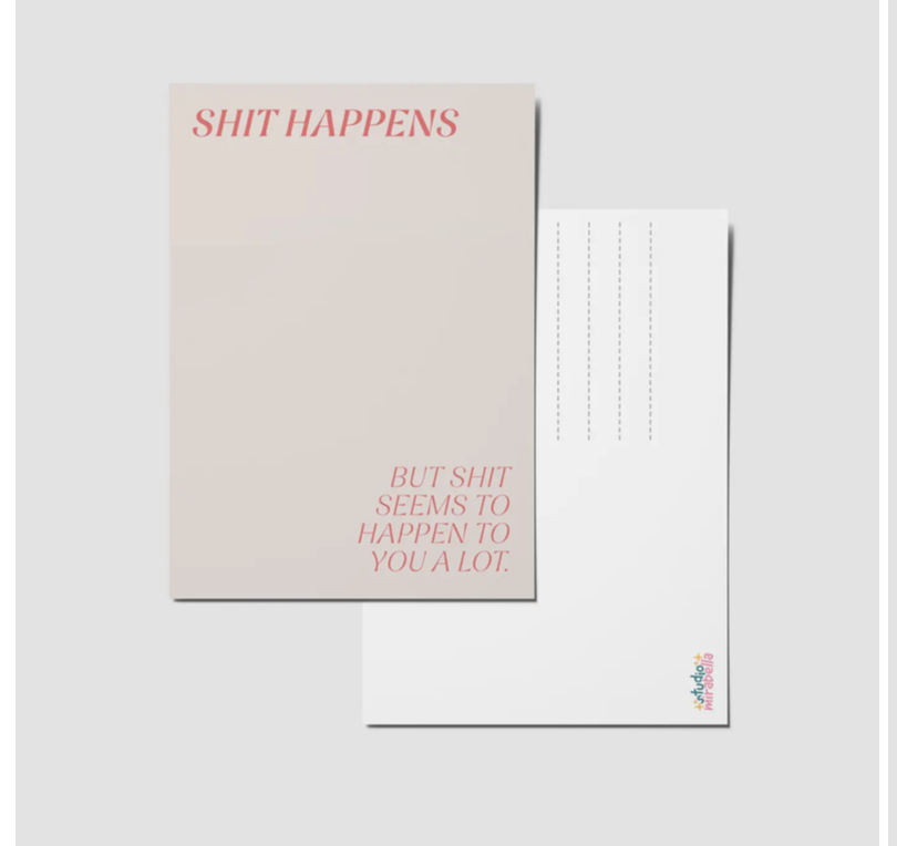 This playful A6 postcard (10.5 cm x 14.8 cm) delivers a cheeky reminder that sometimes, well, shit happens. Perfect for sending a lighthearted message or brightening someone's day with a bit of humor. Its compact size makes it easy to pop in the mail or tuck into a gift.