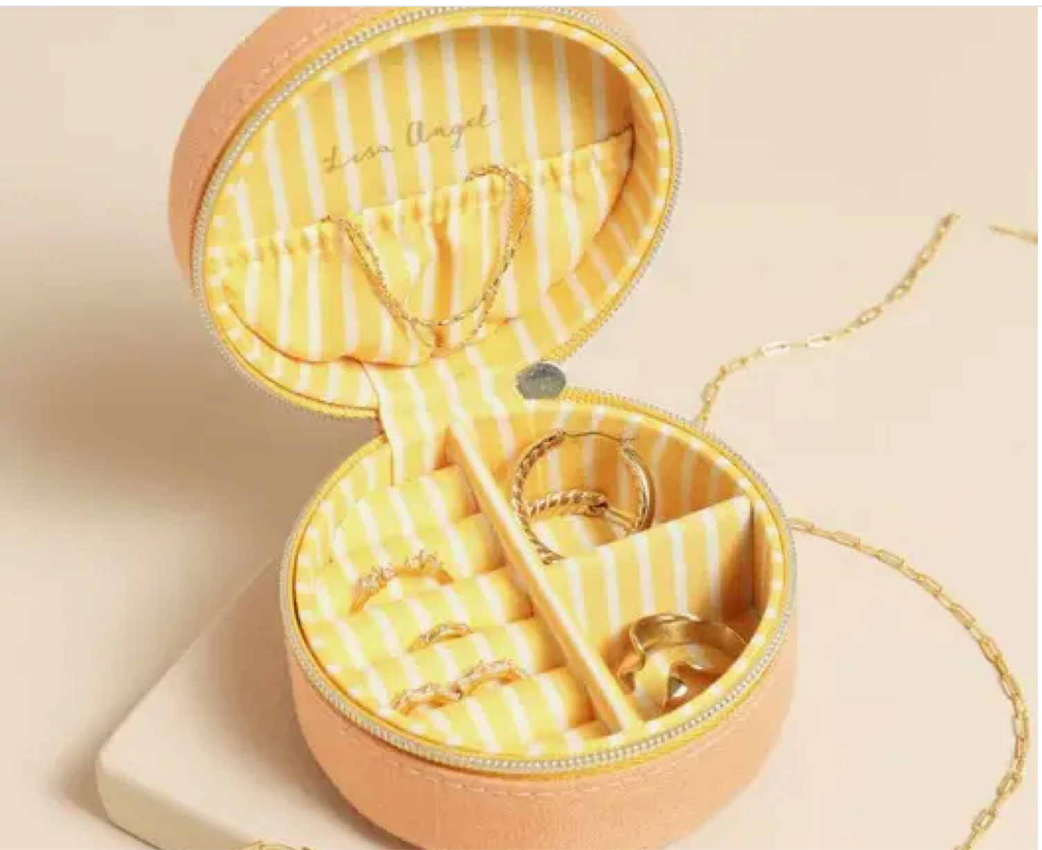 Travel in style with our Souvenir Round Linen Travel Jewellery Case in tangerine. Made from durable linen, this case features ring rolls and small compartments to keep your precious jewellery organized and safe on the go. Perfect for any adventure, big or small!